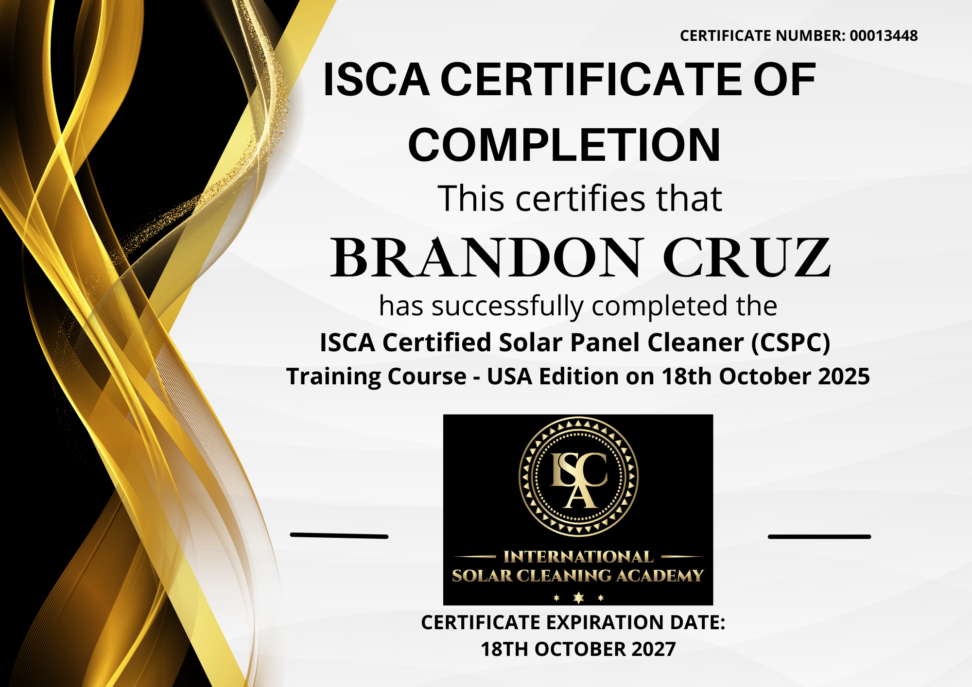 Certificate: ISCA Certified Solar Panel Cleaner (CSPC)